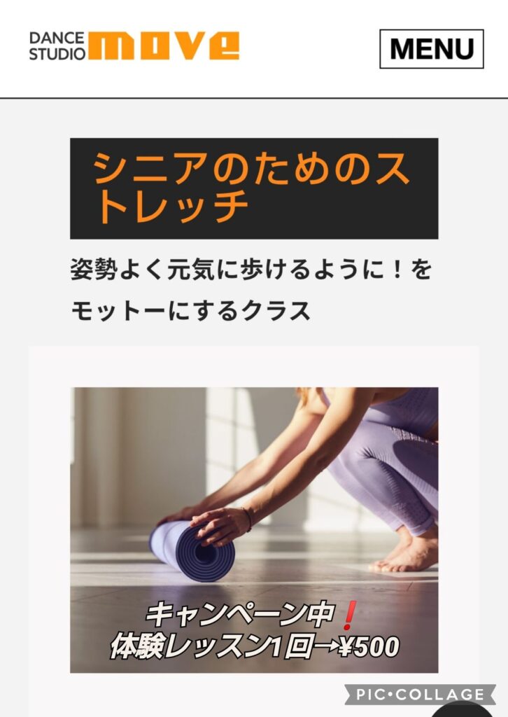 体験レッスン¥500 お知らせ 2026年1月からスタートした シニアのためのストレッチ (金) 16:45~17:45 月4回→¥6050(税込) シニアの方だけではなく 年齢関係なくお試しください。 自分のからだのメンテナンスを 始めてみませんか! キャンペーンは2月末までとなります。 是非ご予約お待ちしています。